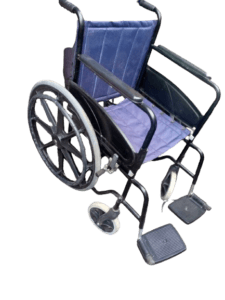 - A sturdy, lightweight steel wheelchair with footrests and padded seating. Folds easily for transport. Ideal for daily mobility for elderly patients or those recovering from injury or surgery.